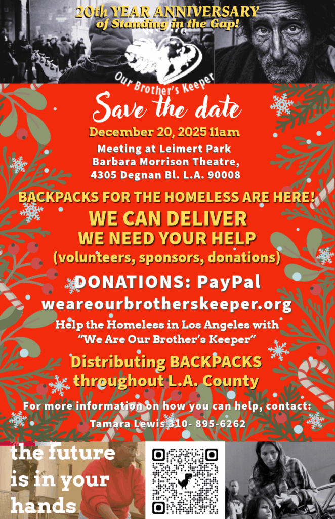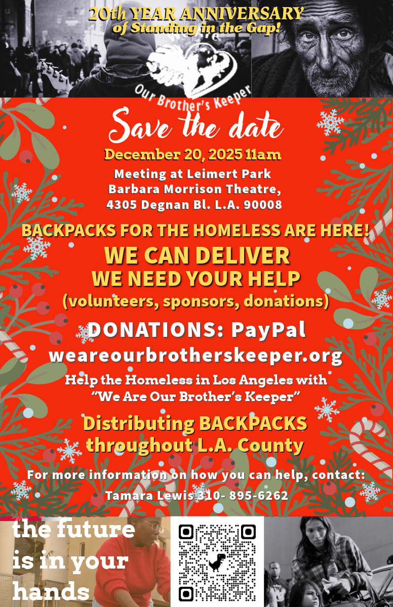 “WE ARE OUR BROTHER’S KEEPER” WILL MEET VOLUNTEERS TO DISTRIBUTE THOUSANDS OF “BACKPACKS” THROUGHOUT L.A. COUNTY & UNDER THE FREEWAY BRIDGES (BackBridge OUTREACH) TO OUR HOMELESS FAMILY… .